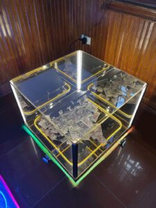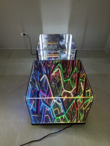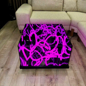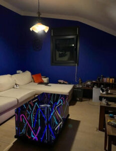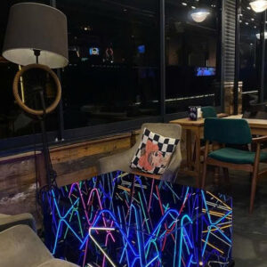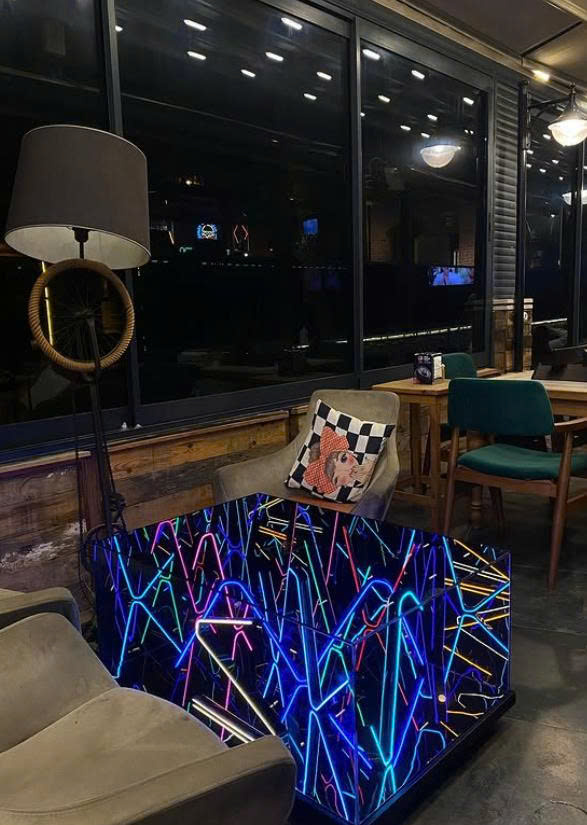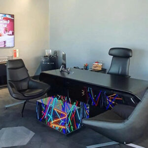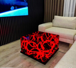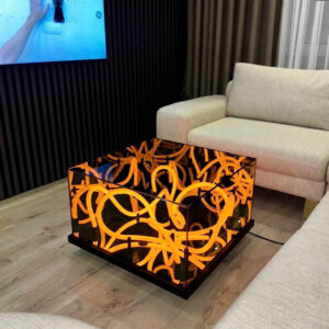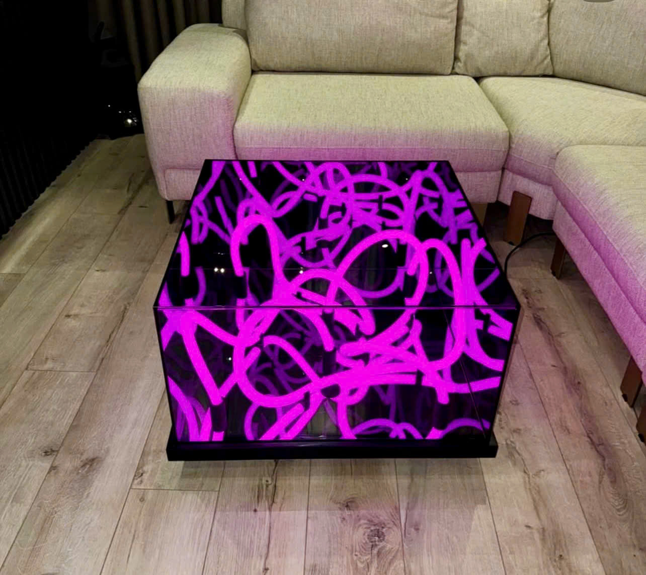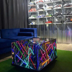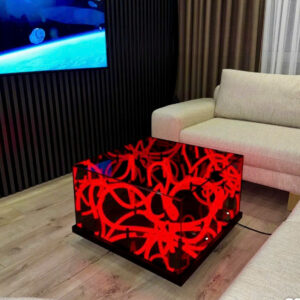 Sản phẩm được làm từ kính cường lực cao cấp có dán một lớp phim hai chiều, bên trong có các sợi led neon, ở dưới đáy bàn là một tấm gương phản chiếu, khi các sợi led neon phát sáng sẽ tạo ra hiệu ứng thị giác độc đáo.